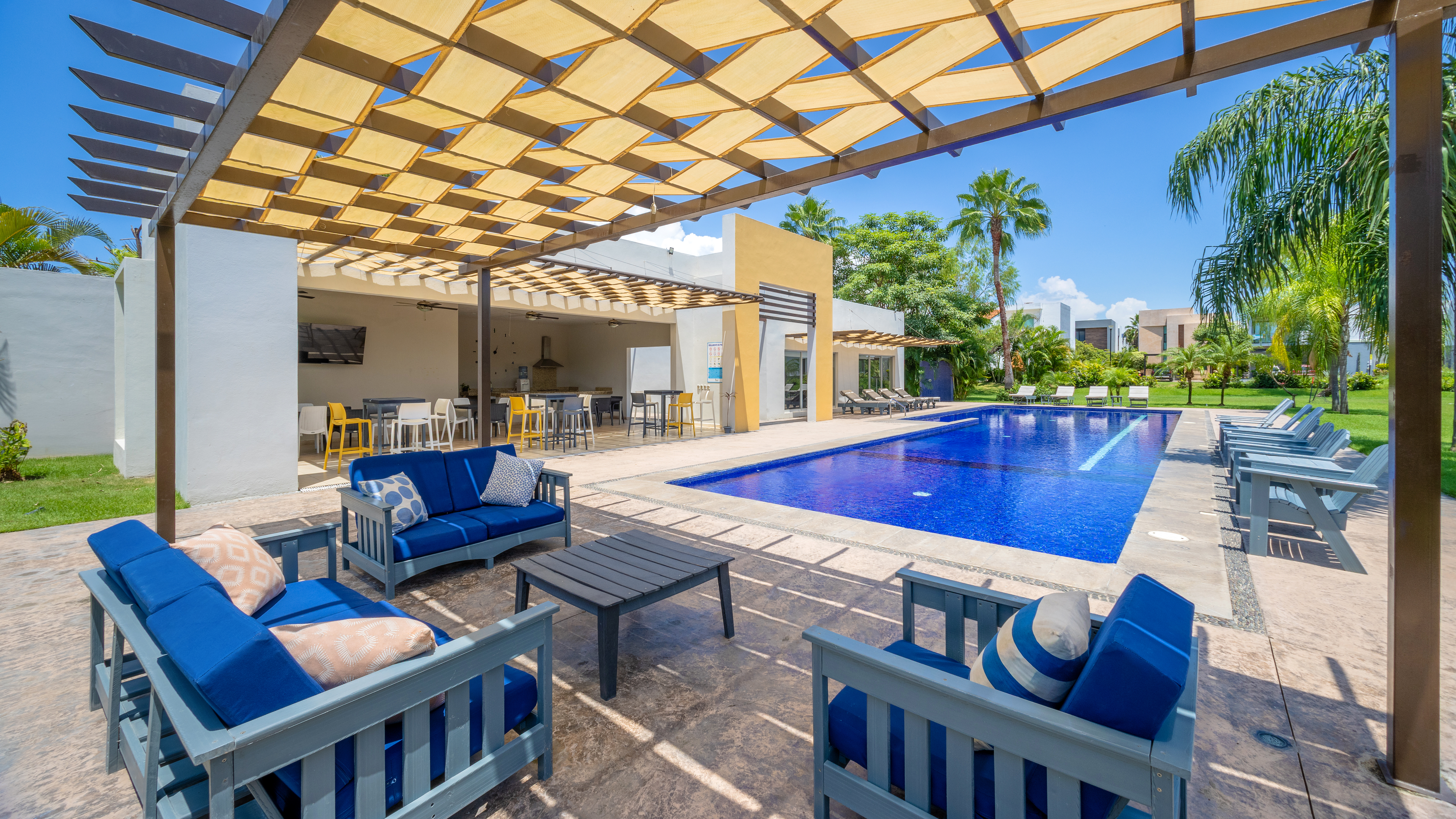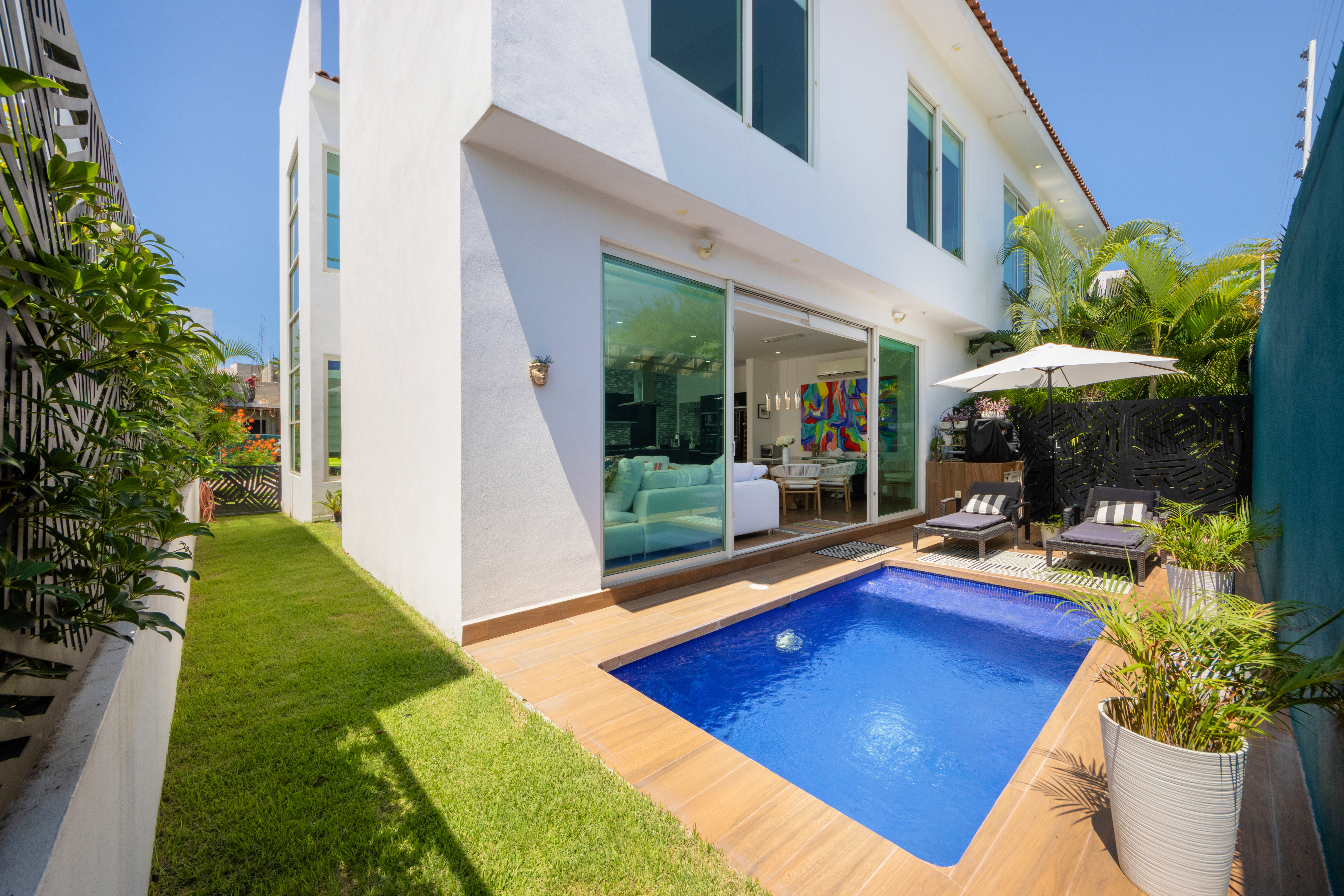 Dream home in IKAL near El Tigre. It’s lovingly furnished with designer furnishings, amazing art and decor, offers 3 bedrooms and 2.5 baths. The master bedroom features a “bath grotto” with huge bathtub and custom lighting and spa like design. Each bedroom has a wall of closets hand carved canopy beds and luxury linens. This house is move in or rental income ready. We are leaving everything down to the dishes and glasses so just bring your toothbrush!! The complex is quiet and secure – the main pool is always sparkling clean and super large. Our private back yard features a heated pool of your very own.